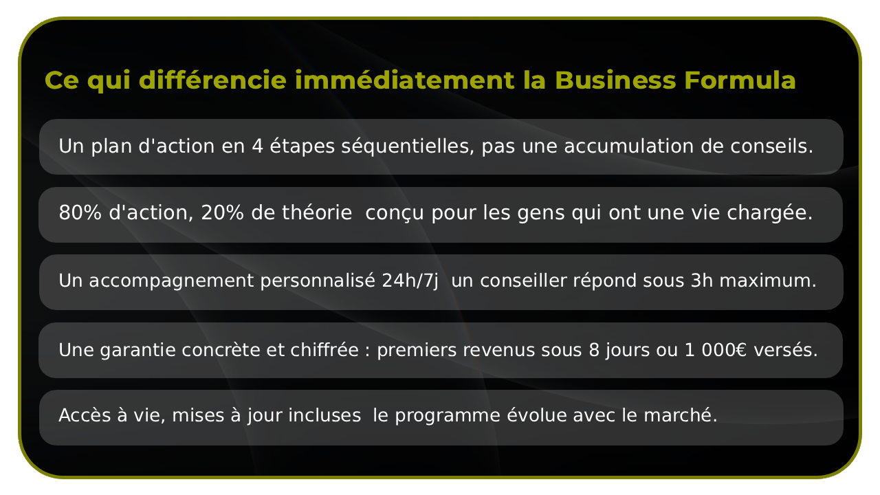 C’est précisément là que la Business Formula fait la différence. La Business Formula repose sur trois différences structurelles majeures qui expliquent ses résultats :