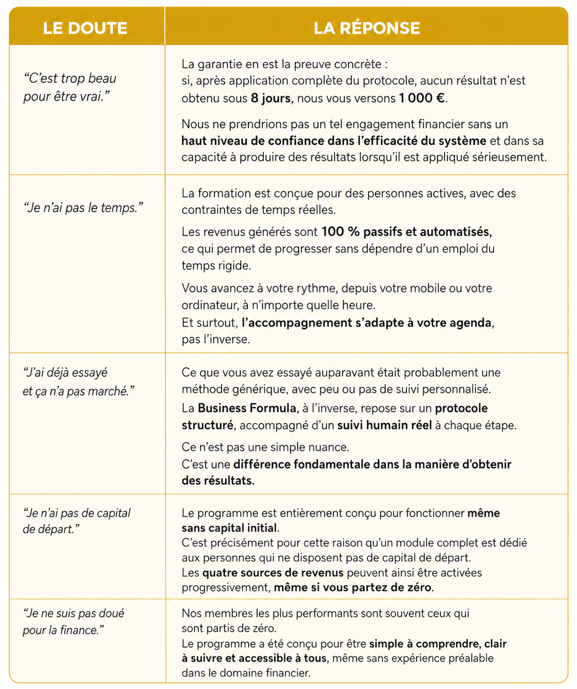 Très peu de formations francophones en développement financier vont aussi loin en matière d’engagement. La Business Formula propose une garantie unique : si, après application rigoureuse du protocole, aucun résultat n’est observé sous 8 jours, vous recevez 1 000 €, tout en conservant un accès à vie à la formation. Cette garantie n’est pas un simple argument marketing. Elle reflète avant tout un niveau de confiance élevé dans la méthode et sa structure opérationnelle, à condition, bien sûr, que le protocole soit appliqué dans son intégralité.