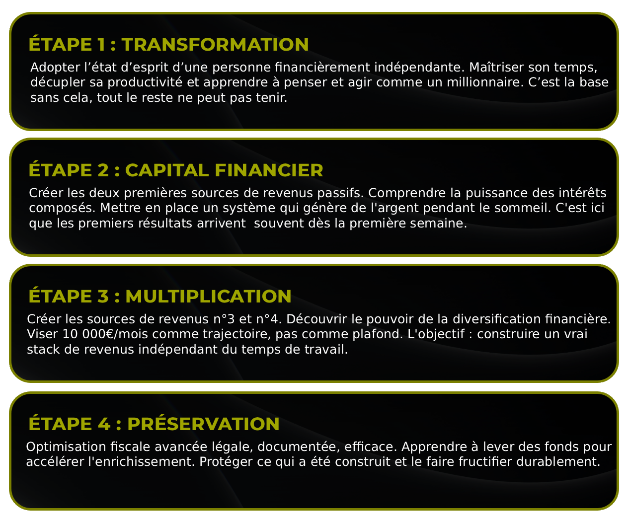 Avant de multiplier ton argent, tu dois d’abord poser les bases solides qui vont permettre à tout le reste de fonctionner. Cela passe par construire le bon état d’esprit, mettre en place les bonnes structures, puis développer les bons actifs. C’est cette progression qui permet d’obtenir des résultats à la fois solides et durables.